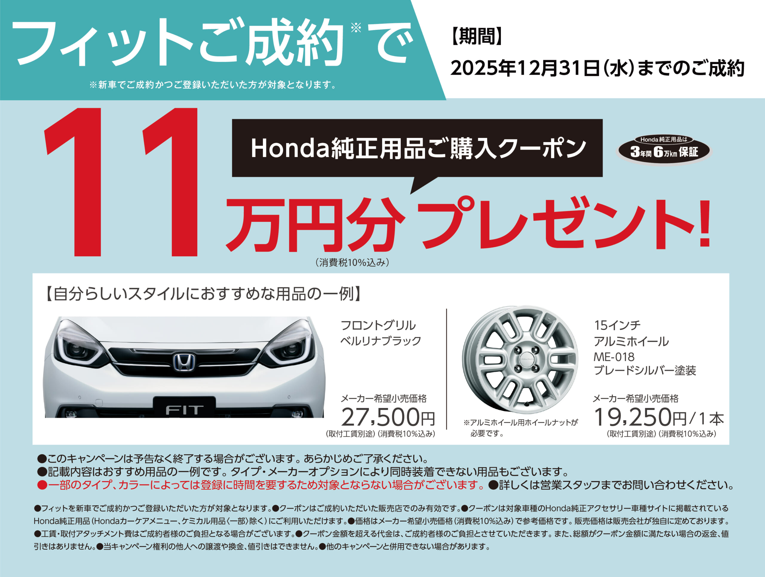 今なら、フィットの新車をご成約かつ登録でHonda純正用品ご購入クーポン11万円分プレゼント!!