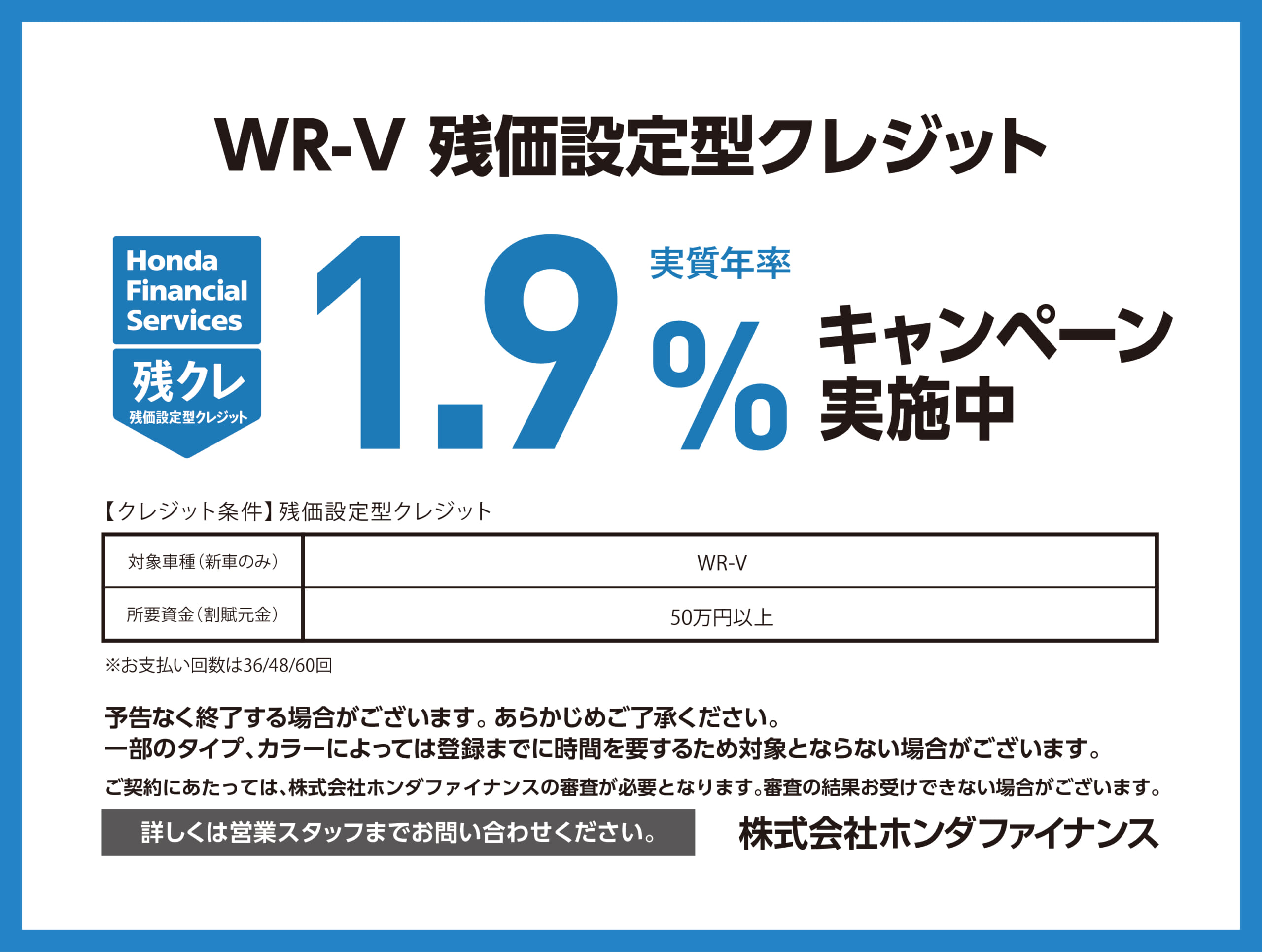 WR-V残価設定型クレジット 1.9%(実質年率)キャンペーン実施中! 2025.10.01 キャンペーン WR-Vが、残価設定型クレジット実質年率1.9%キャンペーン中でお買い時です。詳しくは店頭にてお問い合わせください。