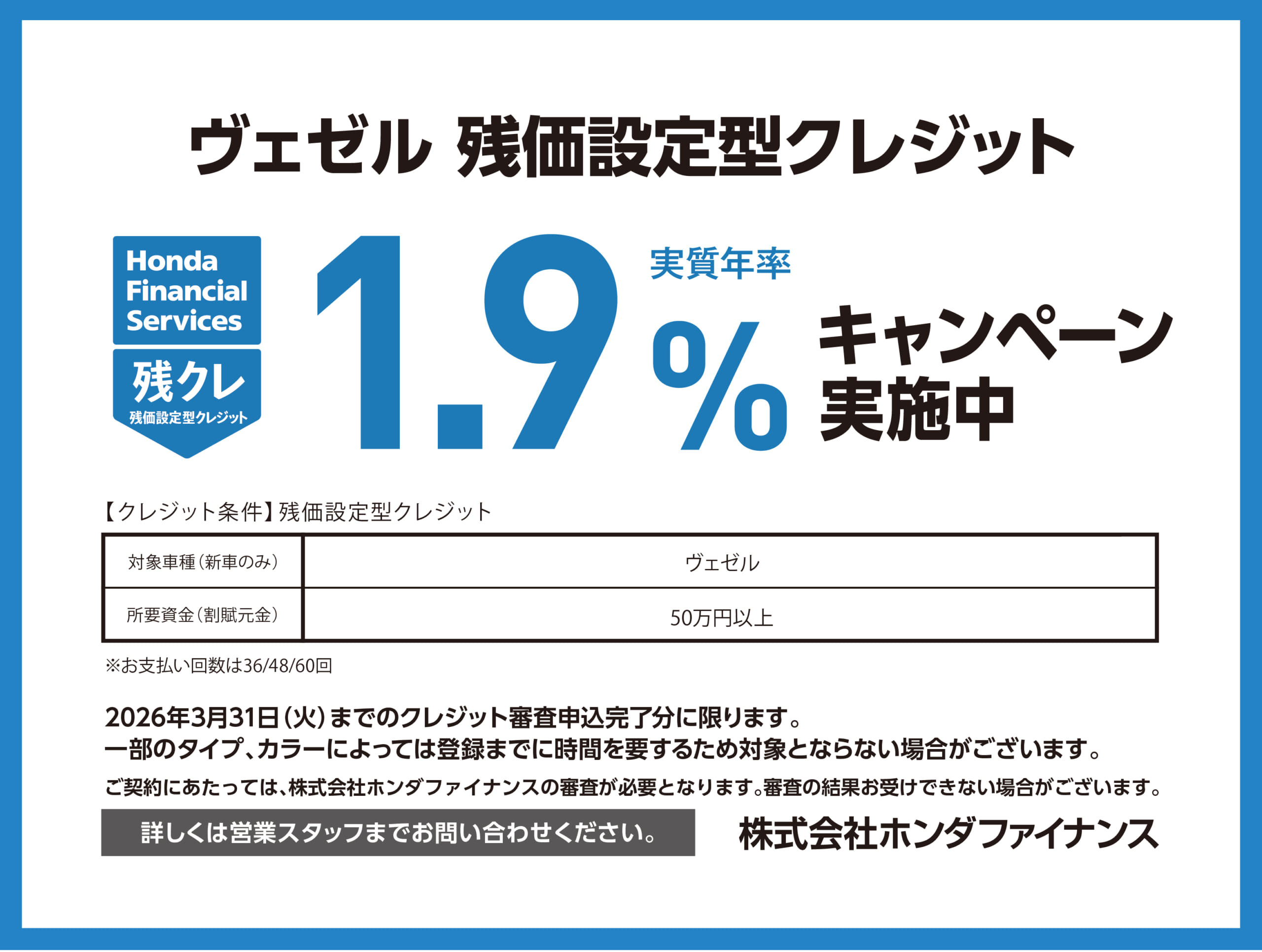 ヴェゼル残価設定型クレジット 1.9%(実質年率)キャンペーン実施中!