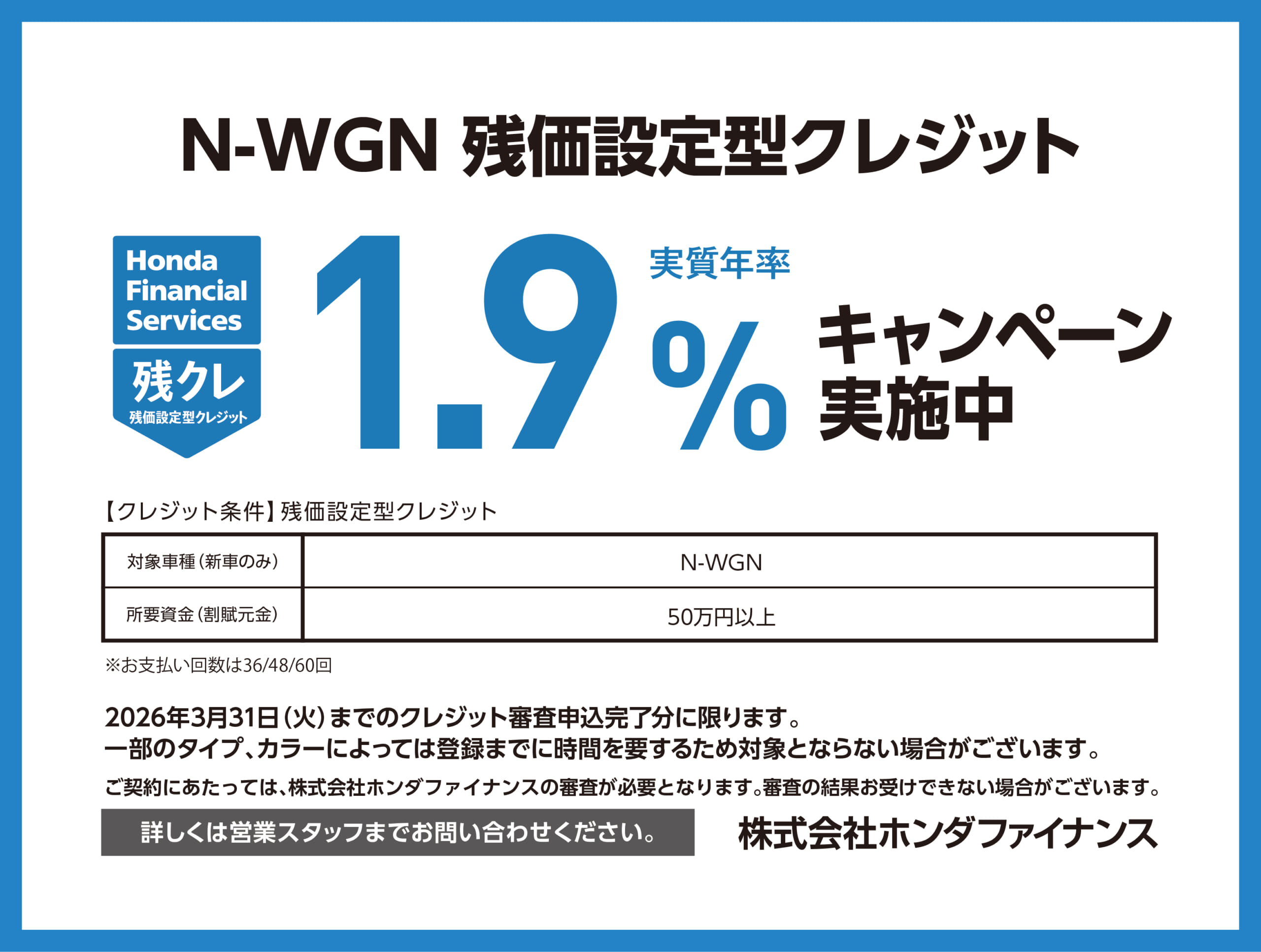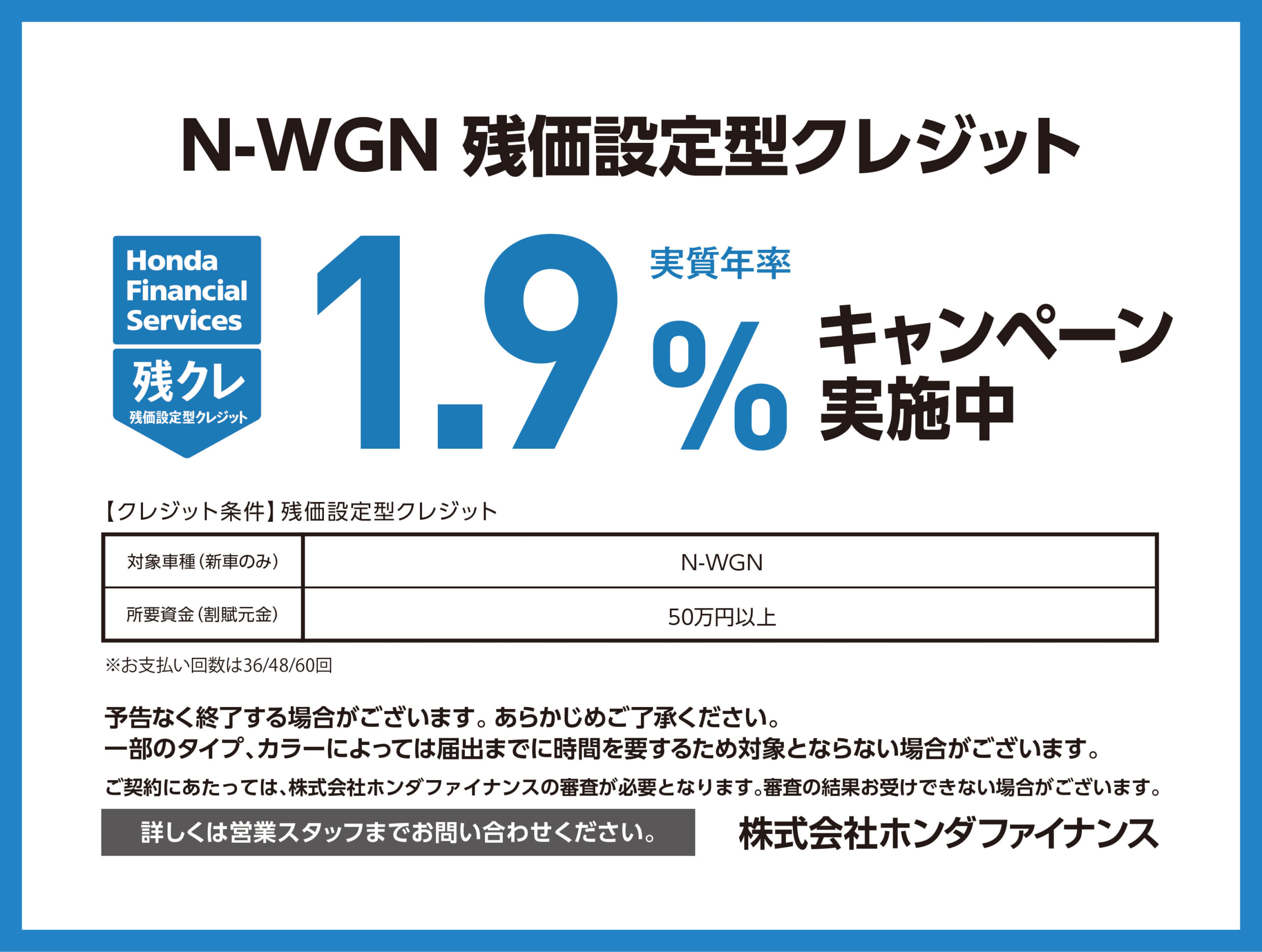N-WGN残価設定型クレジット 1.9%(実質年率)キャンペーン実施中! 2025.12.26 キャンペーン N-WGNが、残価設定型クレジット実質年率1.9%キャンペーン中でお買い時です。詳しくは店頭にてお問い合わせください。