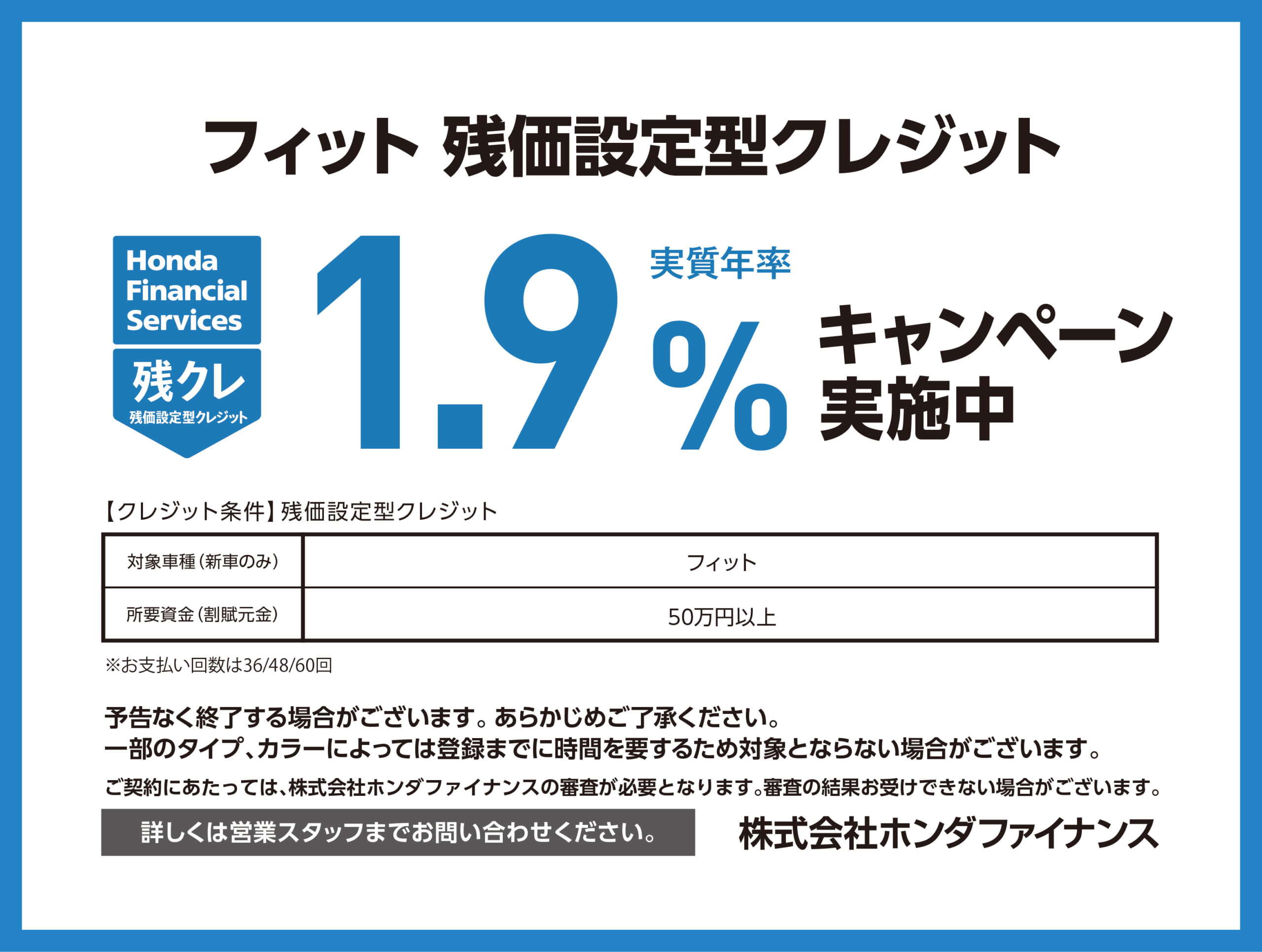 フィット残価設定型クレジット 1.9%(実質年率)キャンペーン実施中! 2025.12.26 キャンペーン フィットが、残価設定型クレジット実質年率1.9%キャンペーン中でお買い時です。詳しくは店頭にてお問い合わせください。